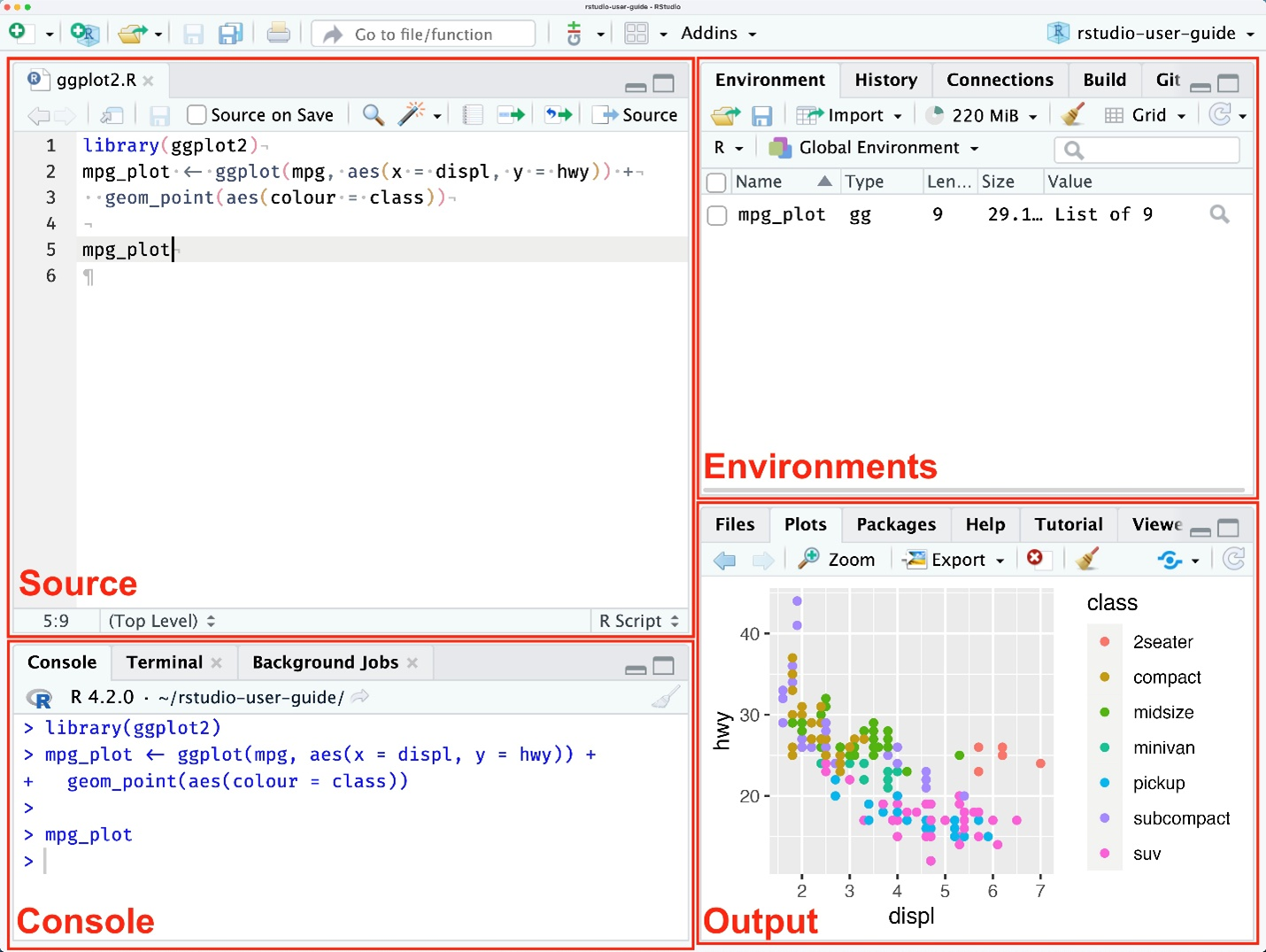RStudio organizes your work into four panes. Each pane has tabs for specific tasks: editing, running code, viewing objects, managing files, plots, packages, or help. This page gives you a plain-English tour of every pane and every default tab—what each does, when you’ll use it, and where to click next.