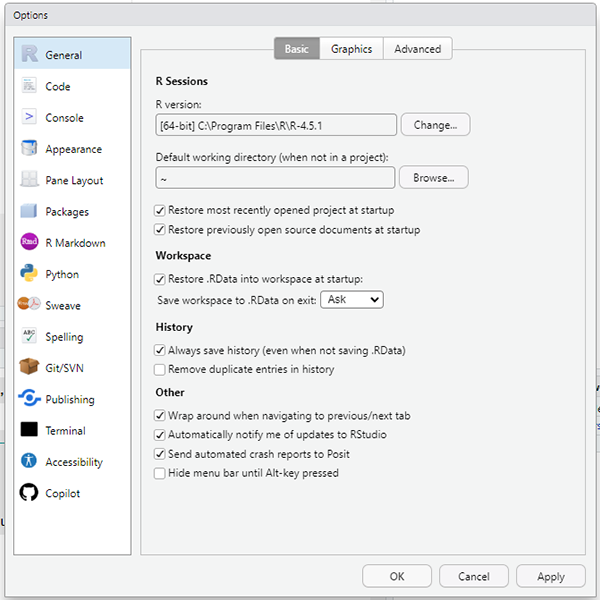 Think of this window as your personal cockpit. Every slider, checkbox, and dropdown lets you fine-tune RStudio’s behavior, appearance, and workflow. Below is a guide to the most-used tabs—so when you’re ready to tweak, you’re not poking around in the dark.