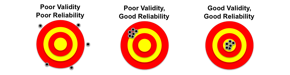 A reliable but invalid measure would be like a tight cluster of arrows that are all in the same spot, but that spot is far from the center of the bullseye. The measure is consistent, but it is consistently wrong.